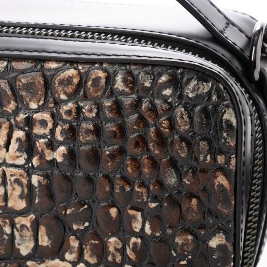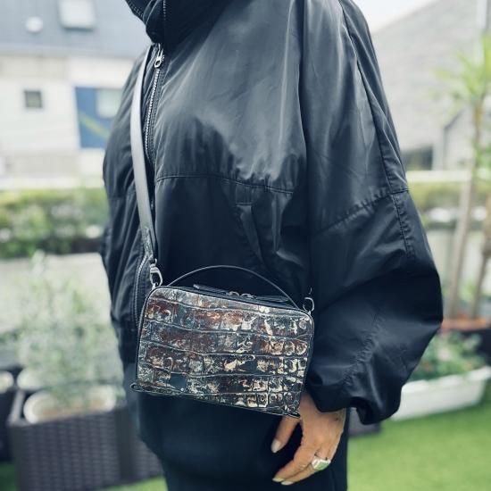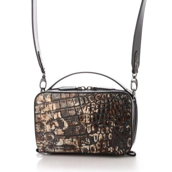 クロコエンボス加工とインクジェットプリントでアンティーク調に仕上げたイタリアンレザーのミニクロスボディバッグ。